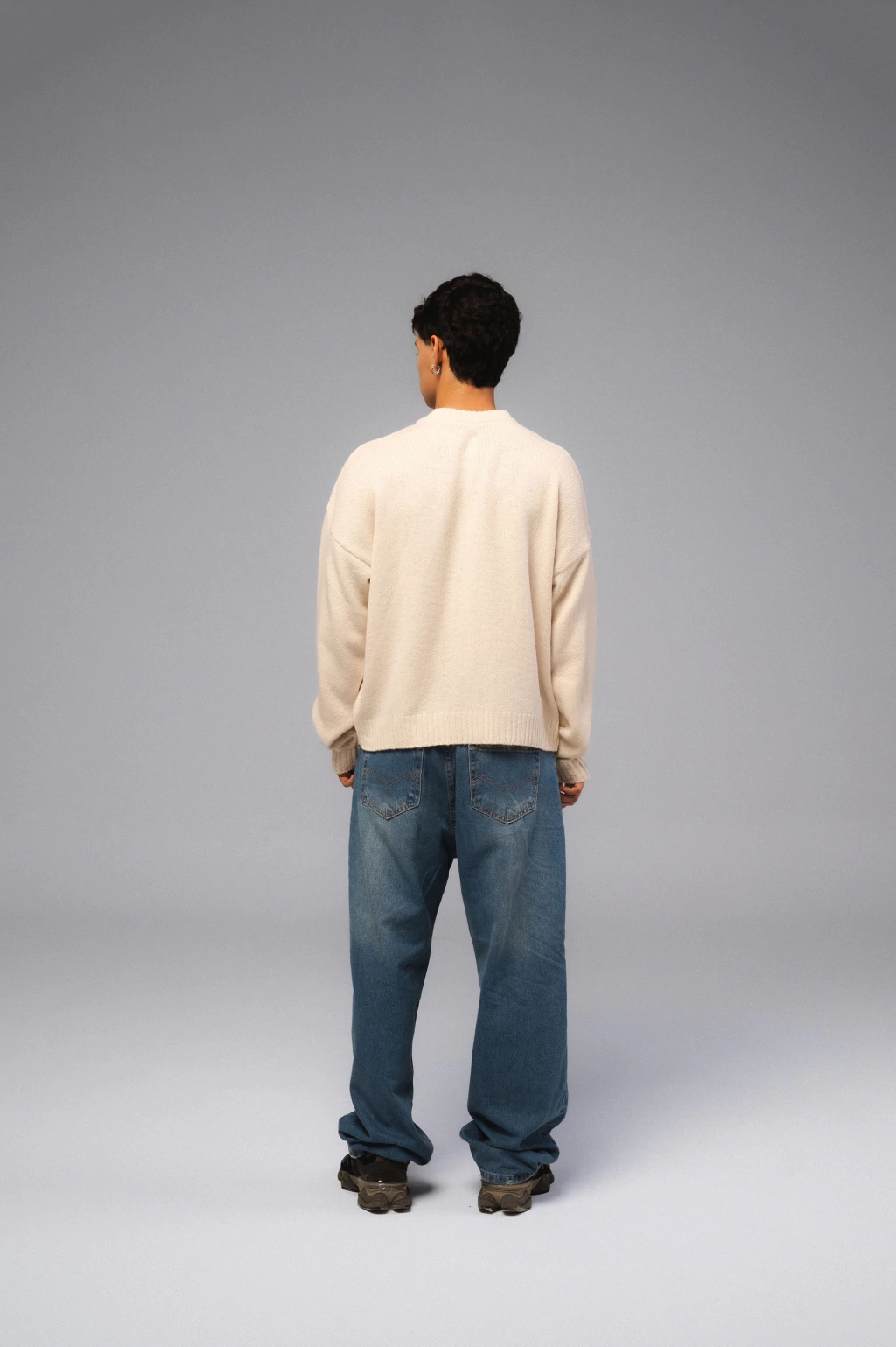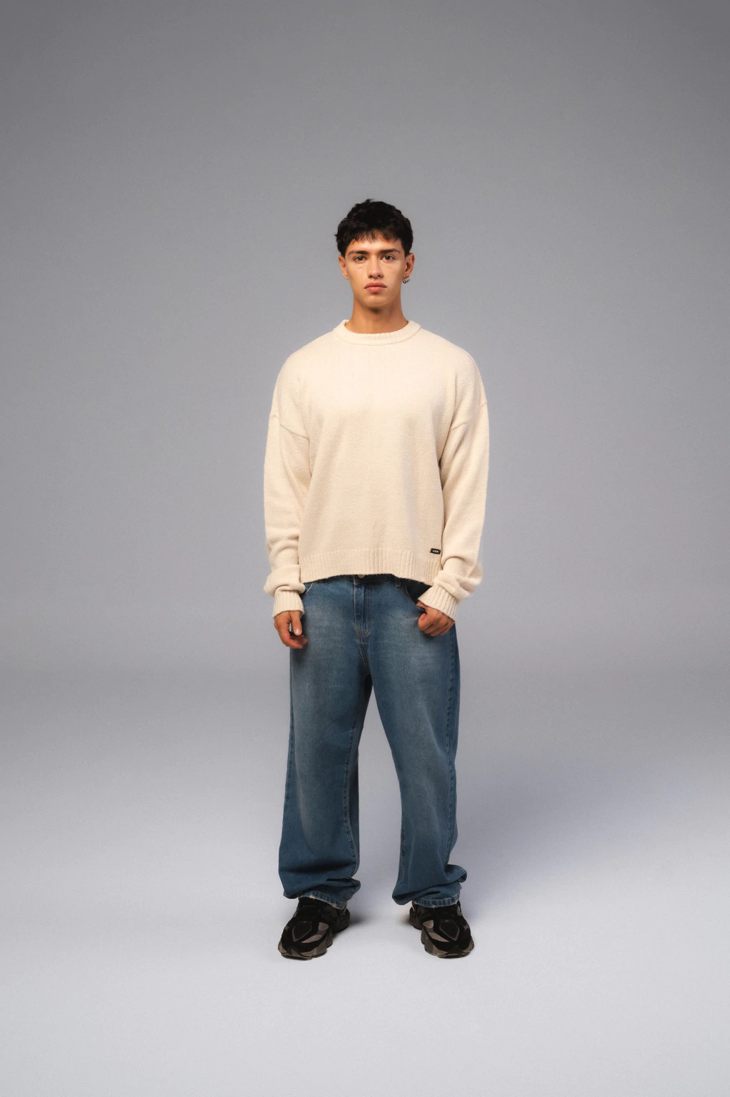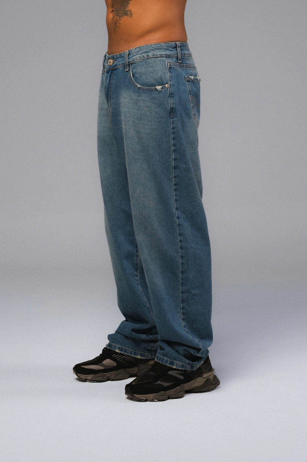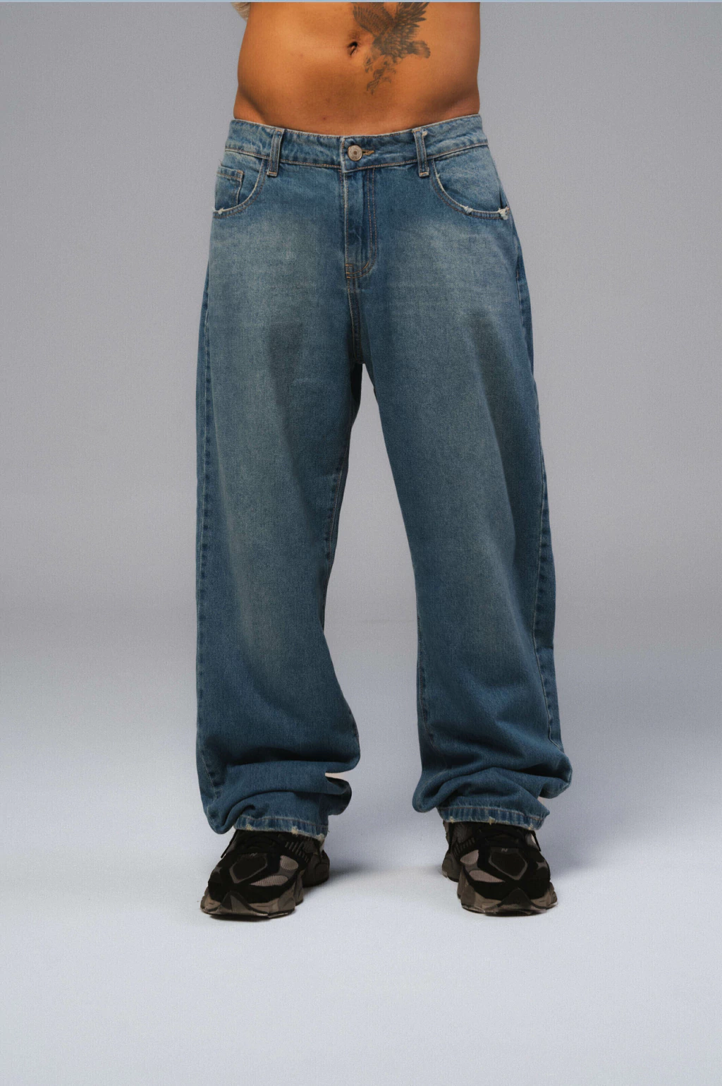 Denim wide leg corte 2000. Es de denim rigido, lavado y tiene detalle de alegoría en bolsillos traseros.