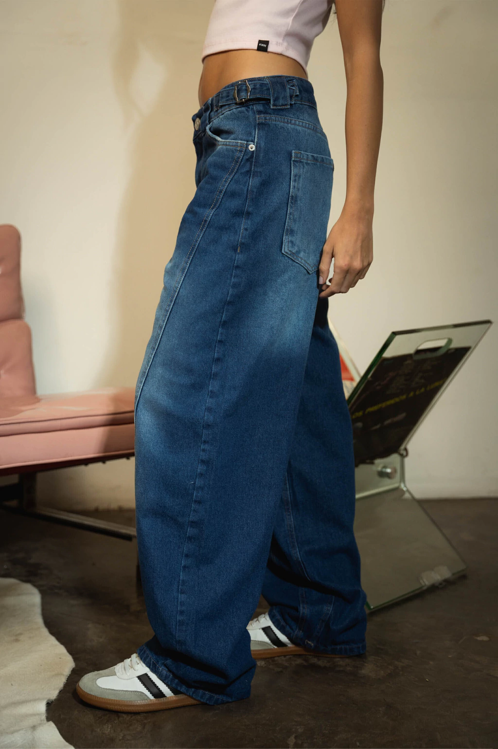 Denim rigido baggy lavado localizado. Tiene como detalle el recorte en el delantero y hebillas para ajustar en el lateral.